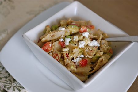 •Dice the avocados and add to the bowl with the pasta as well. Pour the dressing over top and toss to combine. Garnish with extra feta if desired and serve at room temperature or chilled. Avocados may brown if stored overnight.