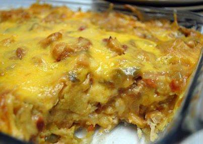 Place the tortillas down in a large casserole dish. Then top with half of the meat mixture and then half of the sauce.