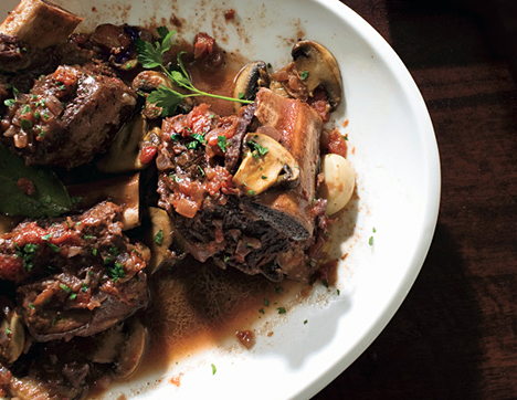 Using slotted spoon, transfer ribs to serving bowl. Discard parsley and bay leaves. Spoon fat off top of sauce and pour sauce over ribs. Serve with bread.