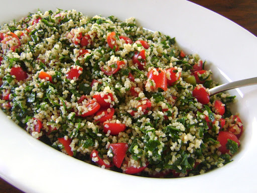 Add parsley, mint, oil, lemon juice and tomato. Mix thoroughly, adding more lemon juice if necessary to give a tart flavour.