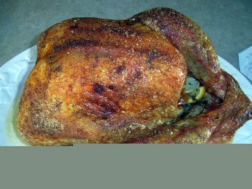 2. Sprinkle salt and pepper in the cavity of the turkey. Quarter the onion and lemon and stuff into the cavity. Also add the thyme. Cut the head of garlic in half and also insert into the cavity.