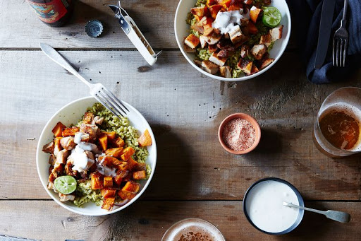 In a large bowl, combine the chopped sweet potatoes, chicken thighs, and red onion. In a smaller bowl, combine 2 tablespoons of the oil with the chile powder, paprika, cumin, coriander, and 1/2 teaspoon of the salt. Stir until well combined. Pour over the chicken and vegetables and mix until everything is well coated with the oil and spice mixture.