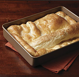 Remove the pan from the oven and pour the batter into the hot fat. Bake until puffed and browned, about 20 minutes. Serve immediately.