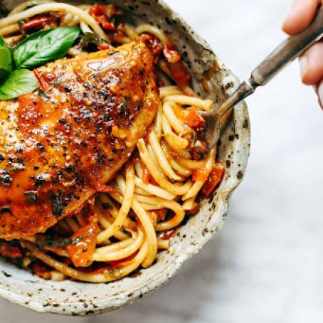 Just before serving, stir in the basil. Top servings of pasta with the chicken and the sauce.