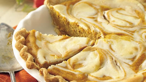 3.Stir milk into reserved cream cheese mixture. Spoon over pumpkin mixture. Cut through cream cheese and pumpkin mixtures with knife in S-shaped curves in one continuous motion for marbled design. Turn pie plate one-fourth turn and repeat.