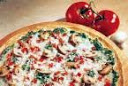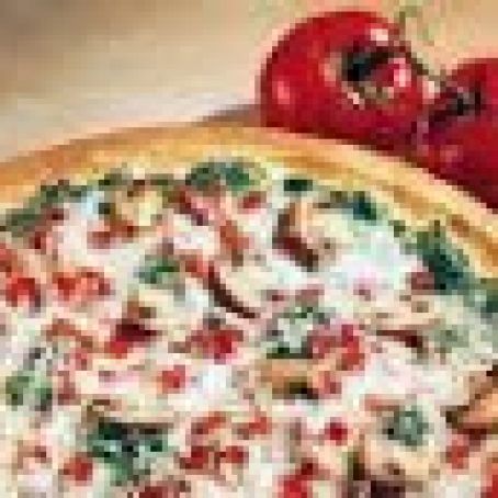 Pizza: In a hot sauté pan or on a griddle, place sliced mushrooms and butter-flavor oil and season with salt, pepper and garlic. 2Cook until hot. 3Brush tortilla with oil and place on griddle. 4Spread spinach and artichoke dip evenly on top of tortilla to within 1/2 inch of the edge. 5Top with mushrooms, when cooked, Italian seasoning and diced tomatoes. 6Sprinkle shredded mozzarella cheese over pizza and remove from griddle and place on a pizza pan in an oven preheated to 350 degrees F. 7Remove from oven when cheese is melted and top with shredded Parmesan/Romano cheese. 8Cut into wedges and serve. 9Spinach and Artichoke Dip: Combine ingredients thoroughly in a bowl and spread mixture into a small baking dish. 10Bake in an oven preheated to 350 degrees F for 30 minutes or until cheeses are bubbling and melted. 11Serve as the "sauce" for the vegetable pizza or as a dip for chips