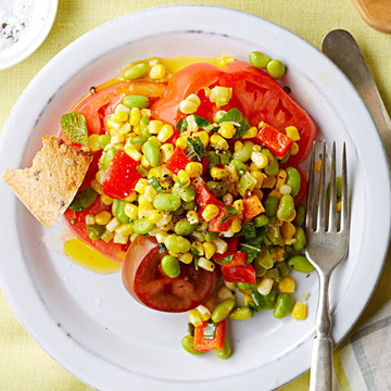 Arrange tomato slices on salad plates or a platter. Sprinkle with remaining 1/4 teaspoon salt. Spoon warm vegetables over tomatoes. Sprinkle with black pepper.