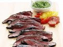 Slice the tomatoes and season with salt and pepper. Thinly slice the steak against the grain. Serve with the tomatoes and salsa verde.