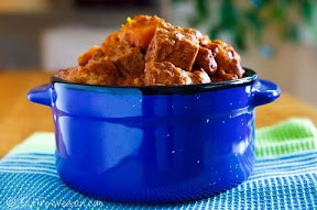 Spray the bottom of the slow cooker with non-stick spray. Spread the tofu, tempeh, and squash on the bottom of the cooker and pour the blender contents over them. Stir to make sure sauce covers all surfaces. Cover tightly and cook on low for 3-6 hours, until sauce is thick and squash is tender. Before serving, check sauce and stir in the sugar, if you like, and salt to taste. Serve over rice or in tortillas.