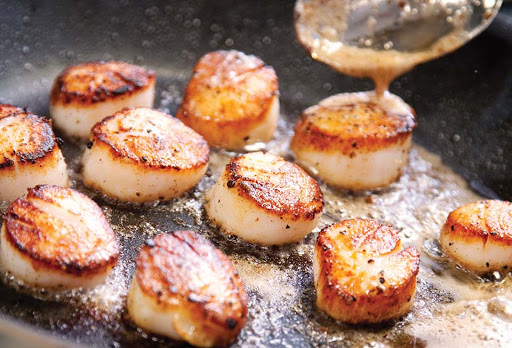 3. Reduce the heat to medium. Add the butter to the skillet and, using tongs, flip the scallops. Use a large spoon to baste the scallops with melted butter as you tilt the skillet and continue to cook the scallops until the sides are firm and the centers are opaque, 30 to 90 seconds. Serve the seared scallops immediately with the lemon wedges.