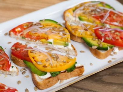 To build: Top each slice of bread with some of the ricotta mixture, 2 slices avocado, 3 slices tomato and some shallots, sunflower seeds and lemon salt to finish. Cut diagonally.