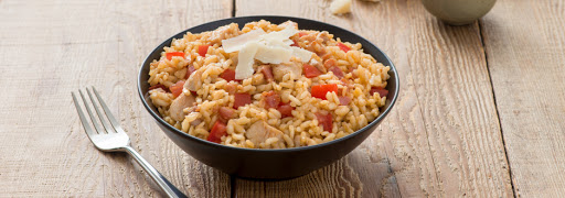 Add rice; cook, stirring, for 1 minute. Stir broth with tomato paste; pour over rice. Cover and bake for 35 minutes or until rice is just tender and most of the liquid is absorbed. Stir in diced tomatoes and Parmesan cheese (if using).