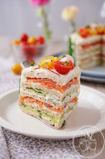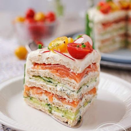 This is not about the picture, its about the great idea. Below is a different recipe than the pic; however, the idea is great. I would not mix it up so much. Suggest flavoring up the cream cheese with a savory cream cheese mixed with regular cream cheese so it will not be strong. Follow your favorite recipes for tuna, chicken, or seafood salads. Or layer with butter, cream cheese, and slices of meats and cheese, with thin slices of tomatoes and onions (if desired) So it is the idea that I am passing on not the actual recipe. Make it your own. The recipe describes making a round cake like form. Suggest going with the loaf method as pictured. Make it your own. You may even want to stick with one kind of filling for the whole thing. Do your thing!