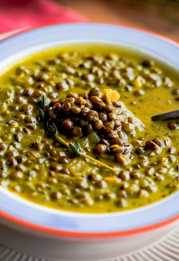 - 1 and 1/2 cups Lentilles de Puy (French green lentils), rinsed and picked over