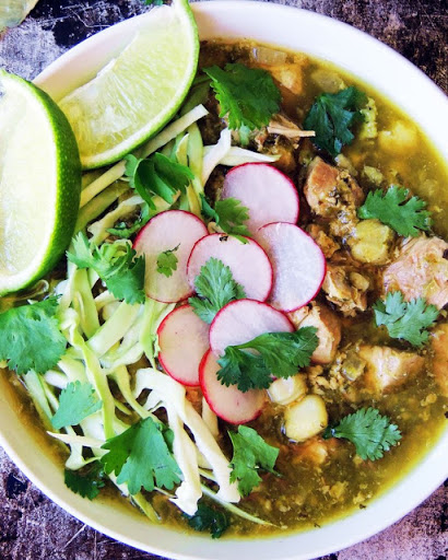 Tags: pork, poblano pepper, Anaheim chilies, onion, garlic, hominy, cilantro, lime, cabbage, radish, slow cooker, Mexican, soup