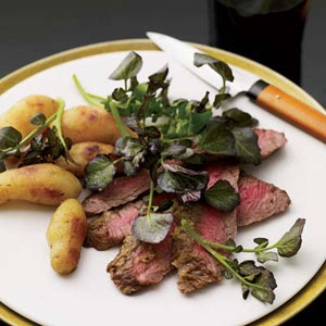 Takashi Yagihashi crusts strip steak with a spicy wasabi-horseradish cream, then serves it with miso-glazed potatoes and deep-fried salsify (a root vegetable). For a healthier way, coat lean but tasty flank steak with bottled horseradish and wasabi -- no cream. Skip the salsify.