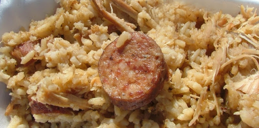 While there are recipes around that include green peppers and other vegetables, purists insist that the only ingredients should be chicken, smoked sausage, rice, salt and pepper and perhaps onion. Put a few drops of your favorite hot sauce on top, and it should be perfect.