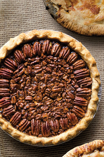 Heat oven to 350°. Whisk corn syrup, sugars, butter, vanilla, salt, and eggs in a bowl; fold in chopped pecans. Distribute filling evenly over dough; arrange pecan halves decoratively around the inside edge of the pie crust. Bake until crust is golden brown and filling is set, about 1 hour. Let cool completely before serving.