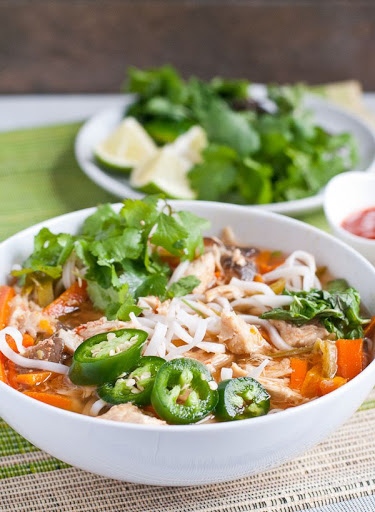 Divide the cooked rice noodles evenly between bowls. Ladle soup on top, then top each serving with a squeeze of fresh lime juice and sprinkle of cilantro, mint, and green onions. Serve immediately.