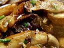 Brush the caps of each mushroom with a clean sponge. Remove and discard the stems. Slice the small mushrooms thickly and cut the large ones in a large dice.