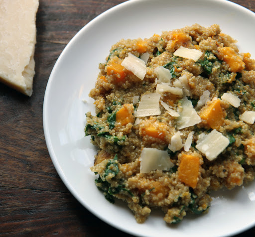 After the quinoa is cooked, add roasted butternut squash, sage, spinach, nutmeg, and salt and pepper. Stir to combine and let cook over low heat until the spinach begins to wilt. Add the shredded Parmesan to the quinoa risotto and stir until the cheese is combined and melts.