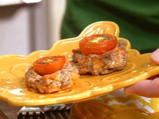Transfer the sausage balls to a baking sheet and flatten each one with the palm of your hand. Make a small indentation in each patty with your thumb and nestle a tomato half, cut side up, in the indentation.