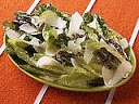 Cut the stems off the heads of Romaine and fan out the lettuce on a serving platter. Sprinkle the Parmesan over the lettuce and drizzle the dressing on top. Serve immediately.