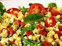 Rub corn with 2 tablespoons of canola oil and season with salt and pepper. Grill or broil corn for 7 minutes or until ears are lightly browned. Remove from grill and allow to cool. Remove the kernels form the cob and place in a large mixing bowl along with the cherry tomatoes, red pepper, scallions, and arugula.