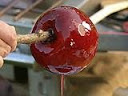 Boil water, syrup, and sugar together until a brown caramel color is reached (at about 250 degrees F on a candy thermometer). Remove from the heat and add cinnamon and red coloring. Cool slightly. Meanwhile force a stick into the core of each apple. Dip the apples 1 at a time into the heavy red syrup, drain well, and place on a buttered baking sheet to cool.