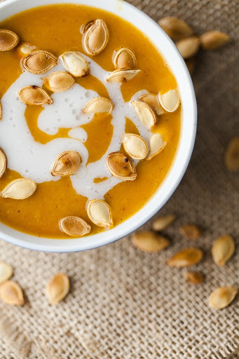 Serve with an extra swirl of coconut milk and roasted pumpkin seeds.