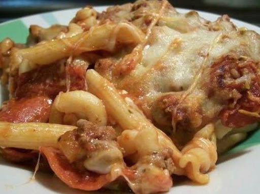 Chop the onion and green pepper.Cook pastas together; drain well.Saute beef, onion, and green pepper until beef is no longer pink and vegetables are soft. Add the pepperoni and heat thoroughly. Drain excess grease.Add spaghetti sauce and simmer 5 minutes.