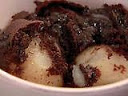 Spread the brown batter over the pears, and bake in the oven for 30 minutes. Let stand for 5 or 10 minutes and then cut into slabs - I cut 2 down and 2 across to make nine slices - and serve with chocolate sauce.