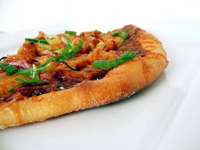4. Spread remaining ½ cup of the barbecue sauce over the pizza dough. Top with chicken, bacon, onions and cheese.