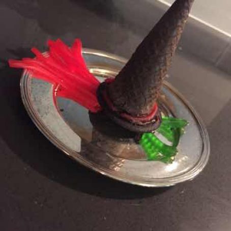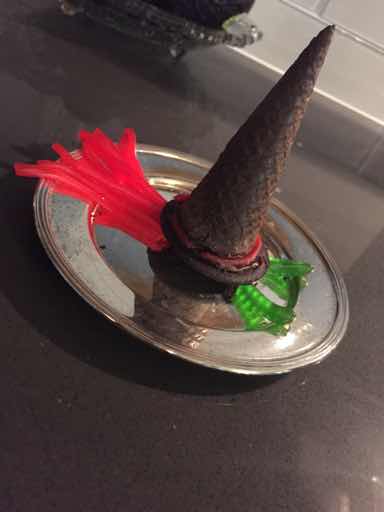 Cute take on a classic Halloween dessert fun for the family to make and eat. This melted witch can be served with a side bowl of ice cream to dip your cone and cookie.
