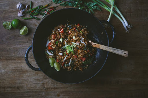 Thai basil is a highly underused herb. It gives a faint licorice fragrance that completely transforms the flavors in a dish. Here, the Thai basil is added right when the heat is turned off. When the fresh Thai basil is gently folded into the steamy rice and still-hot wok, it transforms the entire dish and enhances the flavors of the garlic, chile peppers, and sauce. Immediately a most wonderful smell will waft up. Serve with a gentle squeeze of lime.