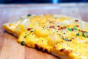 Top pizza dough with Alfredo sauce, cheddar cheese, cubed potatoes, bacon, and scallions. Top entire pizza with additional cheese.