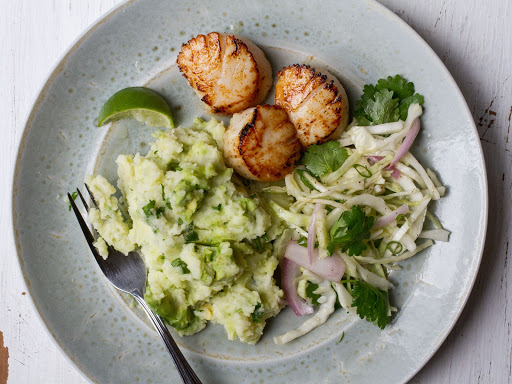 Add remaining cilantro and lime juice, plus the avocados, to the mashed potatoes and mash lightly to incorporate. Season with salt and pepper and serve with scallops, coleslaw, and lime wedges.