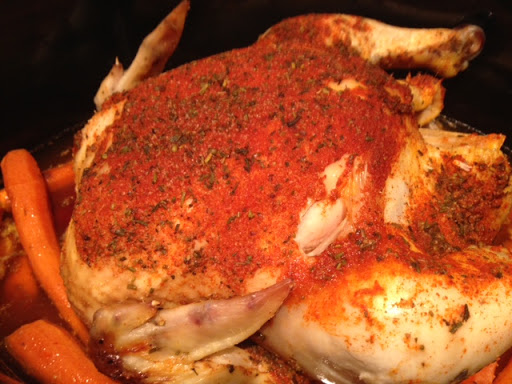 2. Rub the seasoning mixture all over the chicken.Place the garlic cloves and lemon in the chicken cavity.