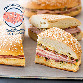 We wanted to do this iconic Southern sandwich justice, so we started with (semi) homemade bread. Store-bought pizza dough bakes up into puffy rounds of bread, and we topped it with sesame seeds just like at Central Grocery in New Orleans. The traditional meats and cheeses—mortadella, salami, hot capicola for kick, and provolone cheese—are layered into the split loaves along with the signature ingredient: olive salad. Ours is a briny, bright combination of olives, capers, giardiniera, garlic, herbs and spices, and just a splash of vinegar for extra tang.