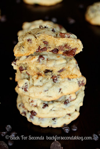 Preheat oven to 350. In a large mixing bowl, cream together butter, oil, & sugars. Add eggs, salt, & vanilla; mix until combined. Add baking soda, cornstarch, & a little bit of flour at a time until combined. Stir in chocolate chips, cover, & chill for 1 hour. Drop heaping tablespoonfuls of dough onto a greased cookie sheet, making sure the mounds of dough are piled high. If using a cookie scoop, scoop one ball of dough right on top of the other. This is what makes the cookies thick! Bake 7-11 minutes. Pull them from the oven when the edges are slightly golden & the centers are barely done. After 2 minutes, transfer cookies to a cooling rack. I got 27 thick cookies that I cooked 10-11 minutes.