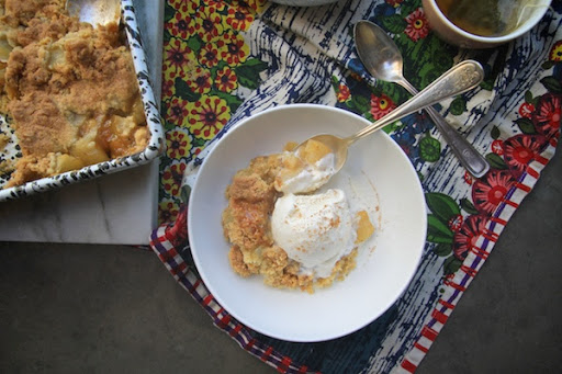 Pour the crumble atop the filling and spread it out evenly. Transfer to the oven to bake for 35 to 40 minutes, or until crumble is bubbling and the top is golden brown. Serve warm with vanilla ice cream and sprinkle the top lightly with cinnamon.