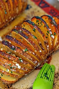 Place the potato on the flat cut side and using chop sticks or wooden spoons, place one on either side of the potato. Make ⅛” thick slices, cutting down to the chop stick or wooden spoon (not all the way through)