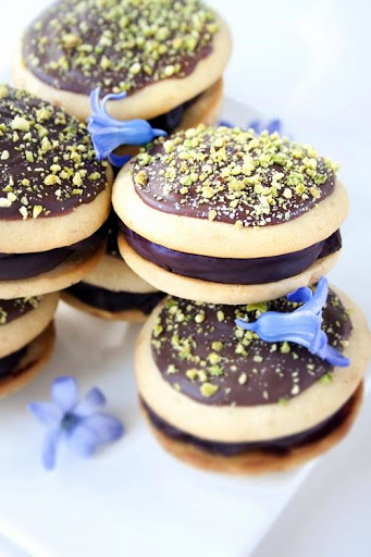 8. Fill a piping bag with the chocolate ganache and pipe onto half the whoopie pie shells, cover with the other shells. To decorate, you can melt the milk chocolate over a hot water bath, spread a teaspoon full over thewhoopie pies and top with ground pistachios.