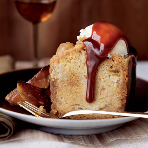 Slice the cake and serve with the caramelized apples, toffee sauce and vanilla ice cream.