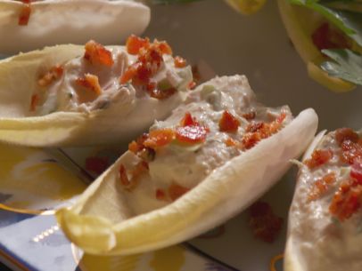Place the endive spears on a platter and spoon a heaping tablespoon of the crab mixture into the center of the leaves. Garnish with a sprinkle of chopped bacon.