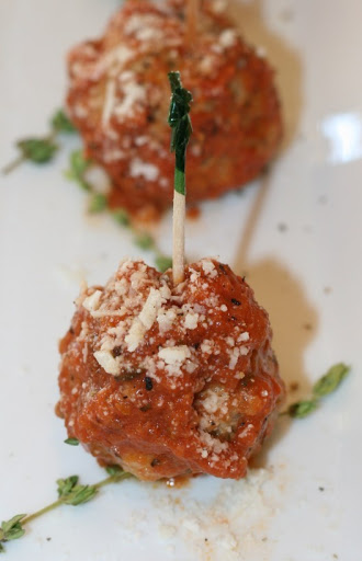 In a large, high-sided sauté pan, add the tomato sauce and bring to a simmer. Add the meatballs to the sauce and bring to a simmer. Cook the meatballs over medium-low heat for 30 minutes. Serve with more grated Pecorino Romano cheese on top.