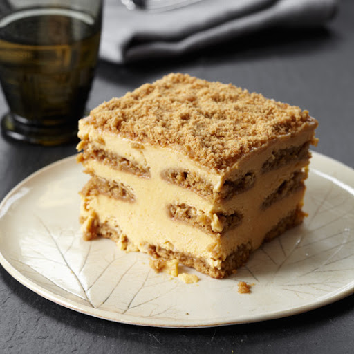 Arrange one-third of the whole gingersnaps in a 9-by-13-by-2 1/2-inch baking dish. Lightly brush the gingersnaps with some of the Calvados and top with one-third of the pumpkin custard. Repeat the layering twice more with the remaining whole gingersnaps, Calvados and custard. Sprinkle half of the crushed gingersnaps on top and press a sheet of plastic wrap directly on the surface of the tiramisù. Freeze overnight.