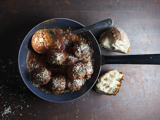 Heat oven to 300°. Grease 2 rimmed baking sheets with oil and set aside. Using a 2-oz. ice cream scoop, portion mixture, roll into meatballs with your hands, and transfer to greased baking sheets. Heat 3 tbsp. oil in a 3-qt. high-sided skillet over medium-high heat. Add half the meatballs; cook, turning occasionally, until browned, about 10 minutes. Transfer meatballs to a plate; wipe out skillet. Repeat with remaining oil and meatballs. Return reserved meatballs to skillet along with any juices from the plate. Add wine; increase heat to high and cook for 2 minutes. Stir in tomatoes and beef stock, bring to a boil, and tightly cover skillet. Transfer to oven; bake until meatballs are tender and have absorbed some of the sauce, about 1 1⁄2 hours. To serve, transfer meatballs to a platter; spoon over sauce. Sprinkle with Parmesan and parsley. Serve with bread or spaghetti, if you like.