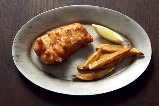 To fry the fish, place filets in the bag of flour to lightly coat, then dip into beer batter, and add to the oil. Fry until golden brown, turning fish occasionally, about 6-9 minutes depending on the size of the filets. Remove from oil and drain on paper towel-lined plate for a minute before plating. Serve fried fish over a generous portion of french fries with wedges of lemon for garnish. Tartar sauce and malt vinegar on the side.