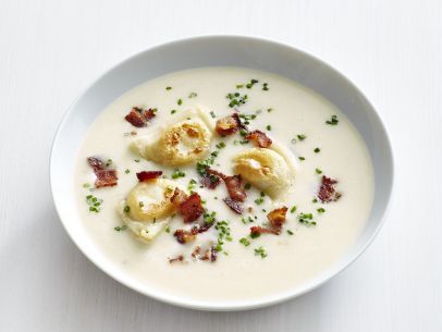Top this potato leek soup with crispy bacon and pierogi for a hearty treat. It’s everything you want in a creamy potato-leek combo with tasty bonuses!